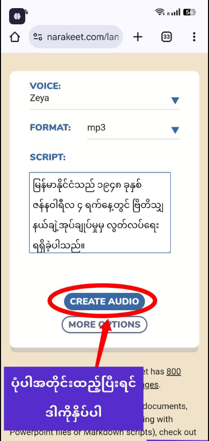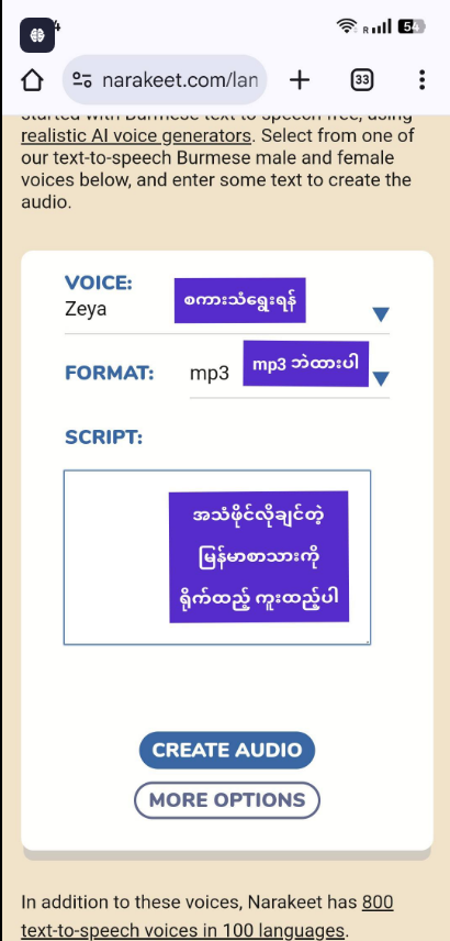 Easily convert text to speech in Burmese, and 100 more languages. Try our Burmese text to speech free online. No registration required.